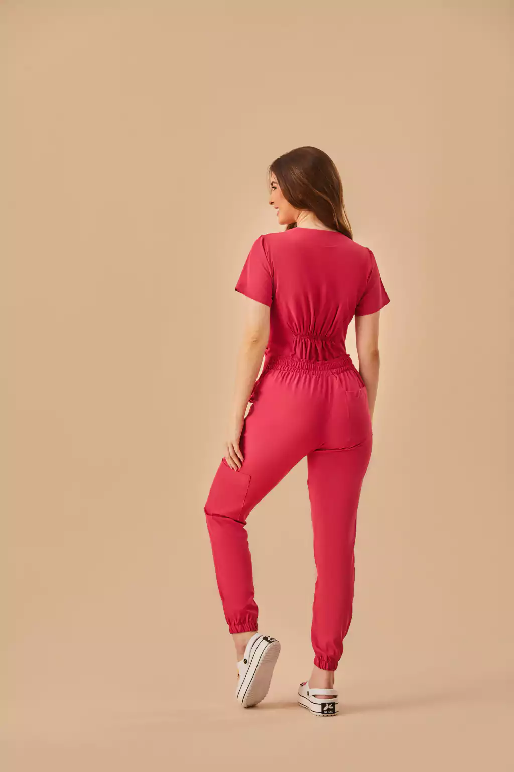 Gola V transpassada, dois bolsos na frente. Elástico nas costas, que modela a cintura proporcionando um caimento perfeito.Calça com pala e elástico na cintura que dá mais conforto ao dia a dia, e com um bolso na parte de trás, lado direito. Elástico nas pernas.