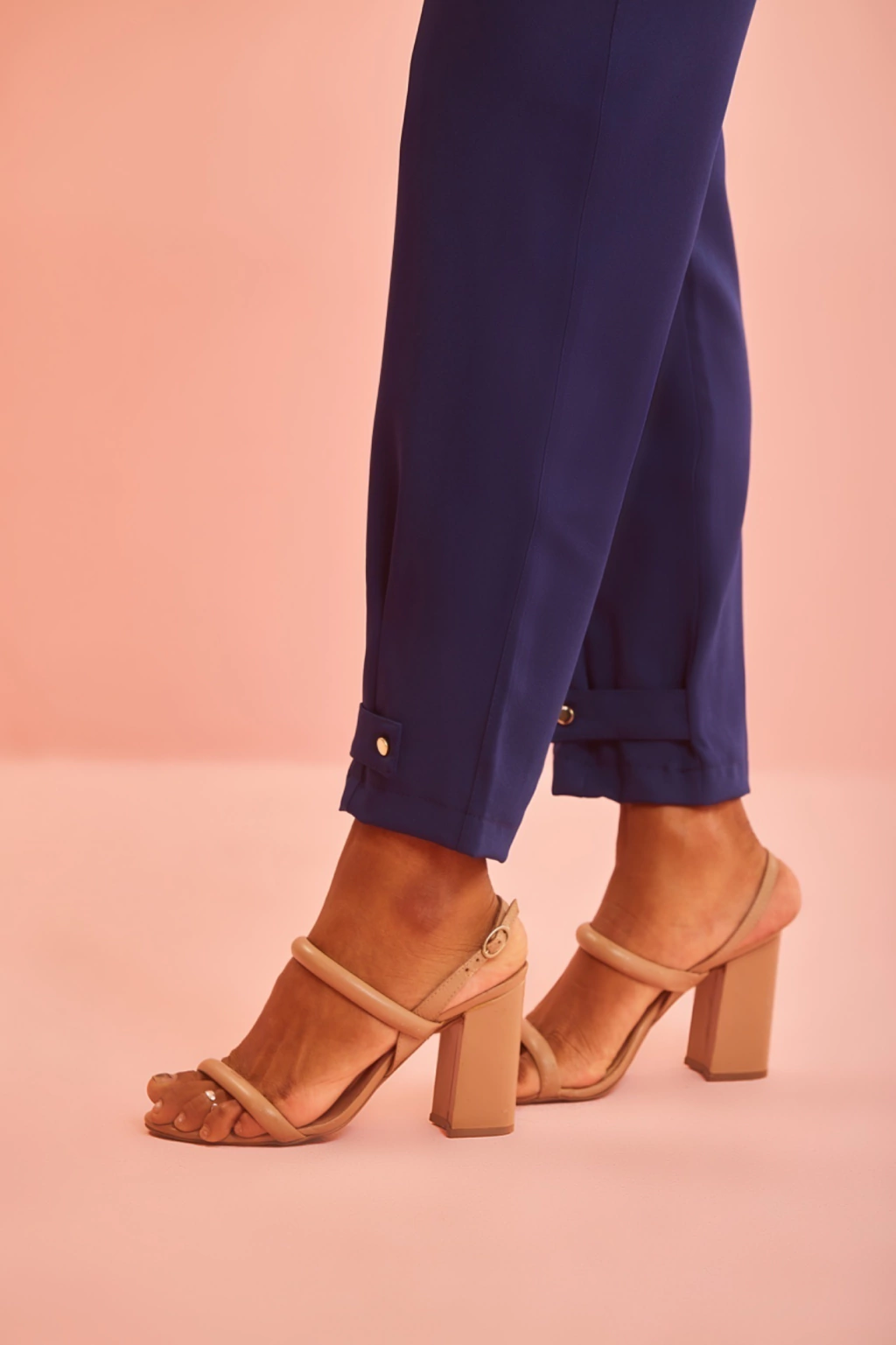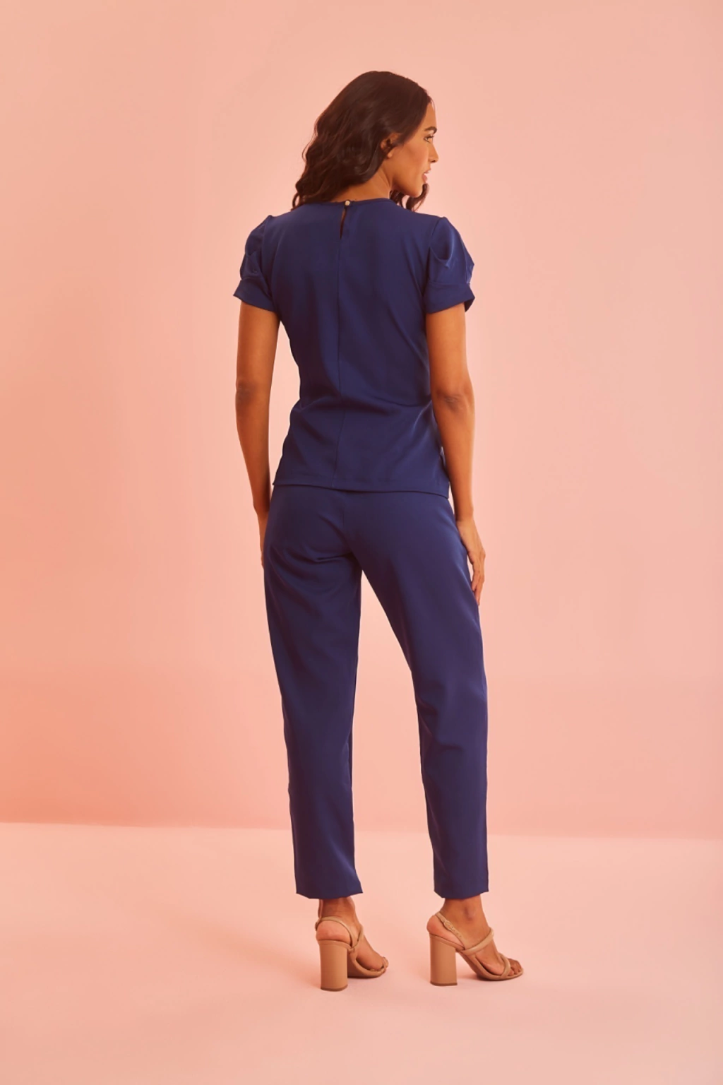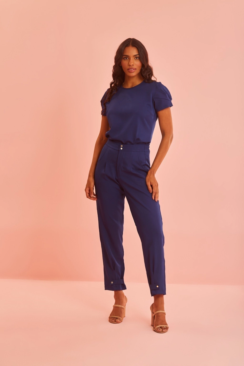Blusa com gola redonda, manga estruturada. Calça com fecho de zíper e botões, elástico na cintura que dá conforto para o dia a dia. Dois bolsos frontais, duas pregas que dão um charme e elegância no caimento da peça. Um botão na perna da calça, super charmoso.