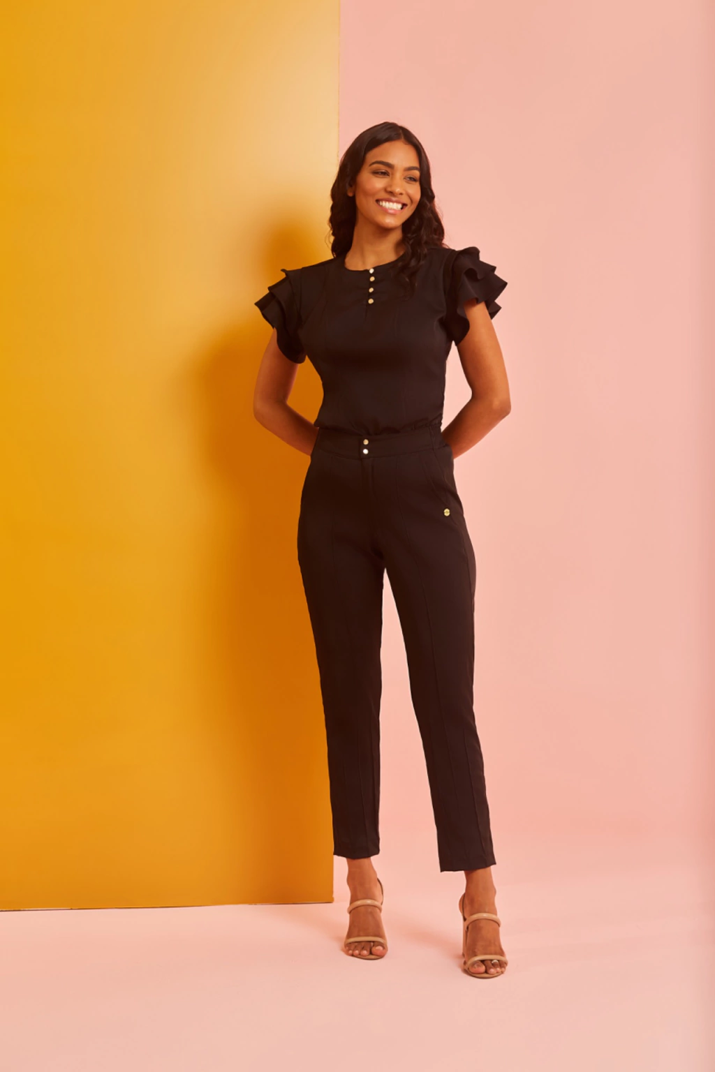 Gola composta por botões deixando a peça mais charmosa e delicada. Caimento perfeito, que modela a cintura. Detalhes no comprimento da calça que dão um charme e elegância. Botão nas costas da blusa. Calça com elástico na cintura, que dá mais conforto pro dia a dia. Dois bolsos na frente, calça reta.